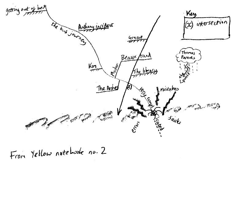 It was all so very complicated, that Henry had had to map it out in one of his notepads, ostensibly so that Thomas could get a grasp of the finer details, but since drawing gave Henry the greatest pleasure, more even than the multiplication table, this might also have been a secondary motive. The resulting map looked a bit like a line dropped diagonally, transacted by another at a steeper angle, and finishing in a spider like knot, that might have represented the moment of splash down of some uncontrollable flying object, but was in fact the descent from muddle into maelstrom. But then, Henry began to elaborate with little diagrammatic intersections, and the whole thing began to take shape. He began with his bedroom showing clearly the position of the bed and various hypothetical alternatives.